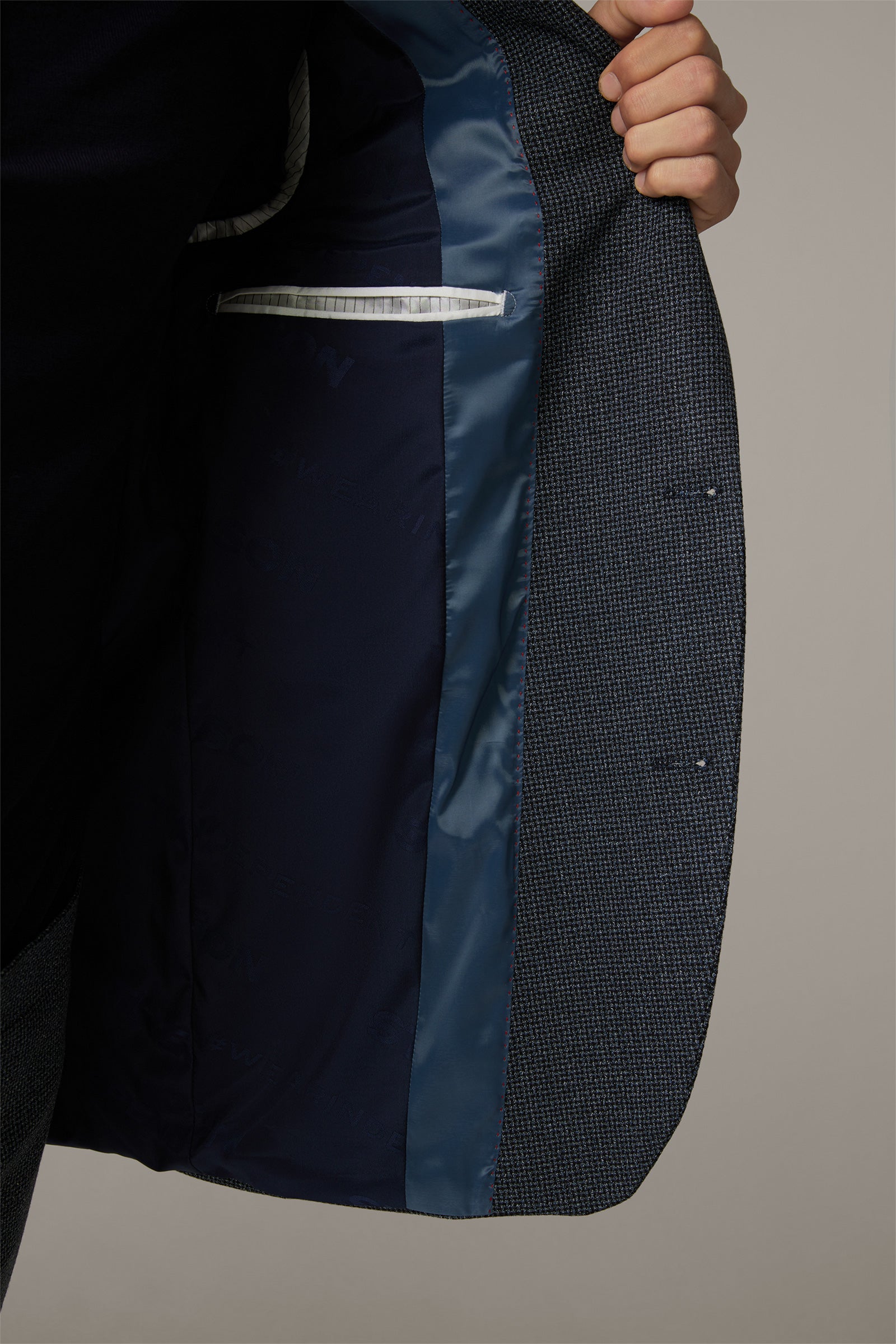 - Classic lapel collar with decorative buttonhole on the left.