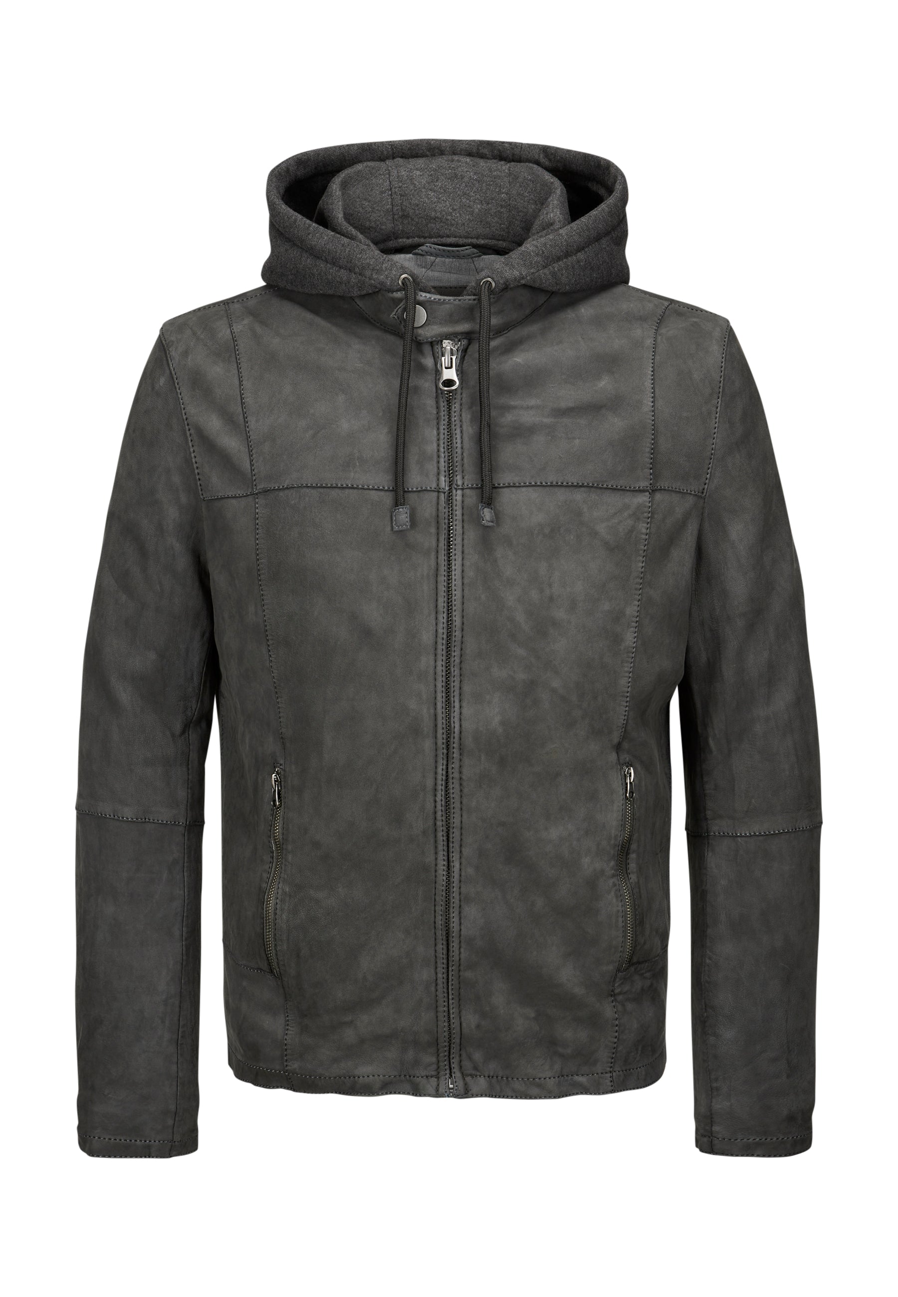 The grained sheepskin leather comes in a warm tobacco brown with a matte nubuck finish, which is given a vibrant patina through a special treatment. The soft leather molds comfortably to the body, while the padding provides extra warmth. The striking metal zippers and stand-up collar emphasize the urban biker style, perfect for city life and leisure. The detachable jersey hood insert and the side zip pockets offer practical flexibility.