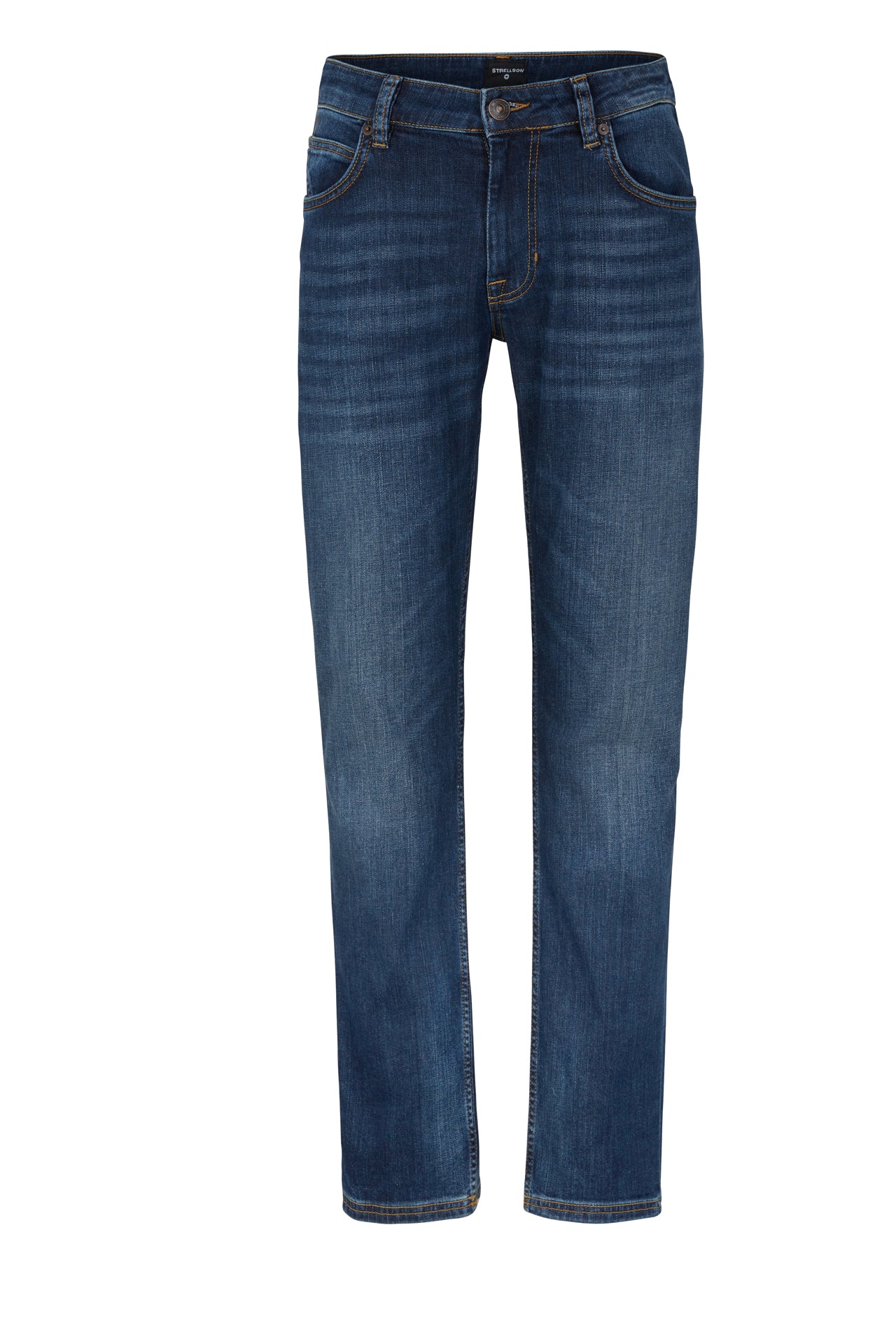 An essential model for everyday looks: the Robin five-pocket jeans with a fitted cut, high-performance Flex Cross quality. The contrasting seams, the washing with a worn look, the folds with an effect already worn and the logo details characterize its design.